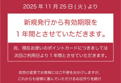 毎度当店をご利用いただき誠にありがとうございます。ポイントカード有効期限のお知らせです。何卒ご理解の程よろしくお願いします。...