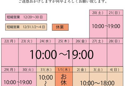 クリスマス期間、年末年始の営業時間が変則的になります。 ご迷惑おかけしますが何卒よろしくお願い致します。...